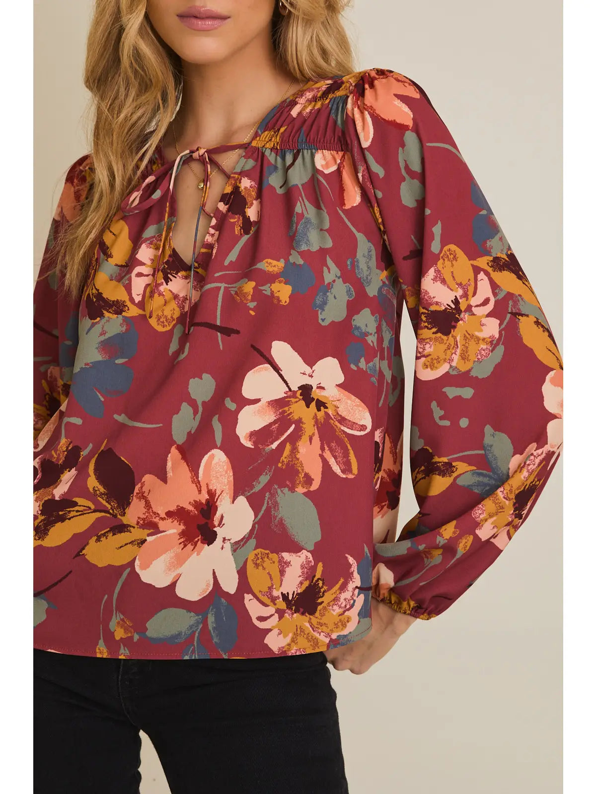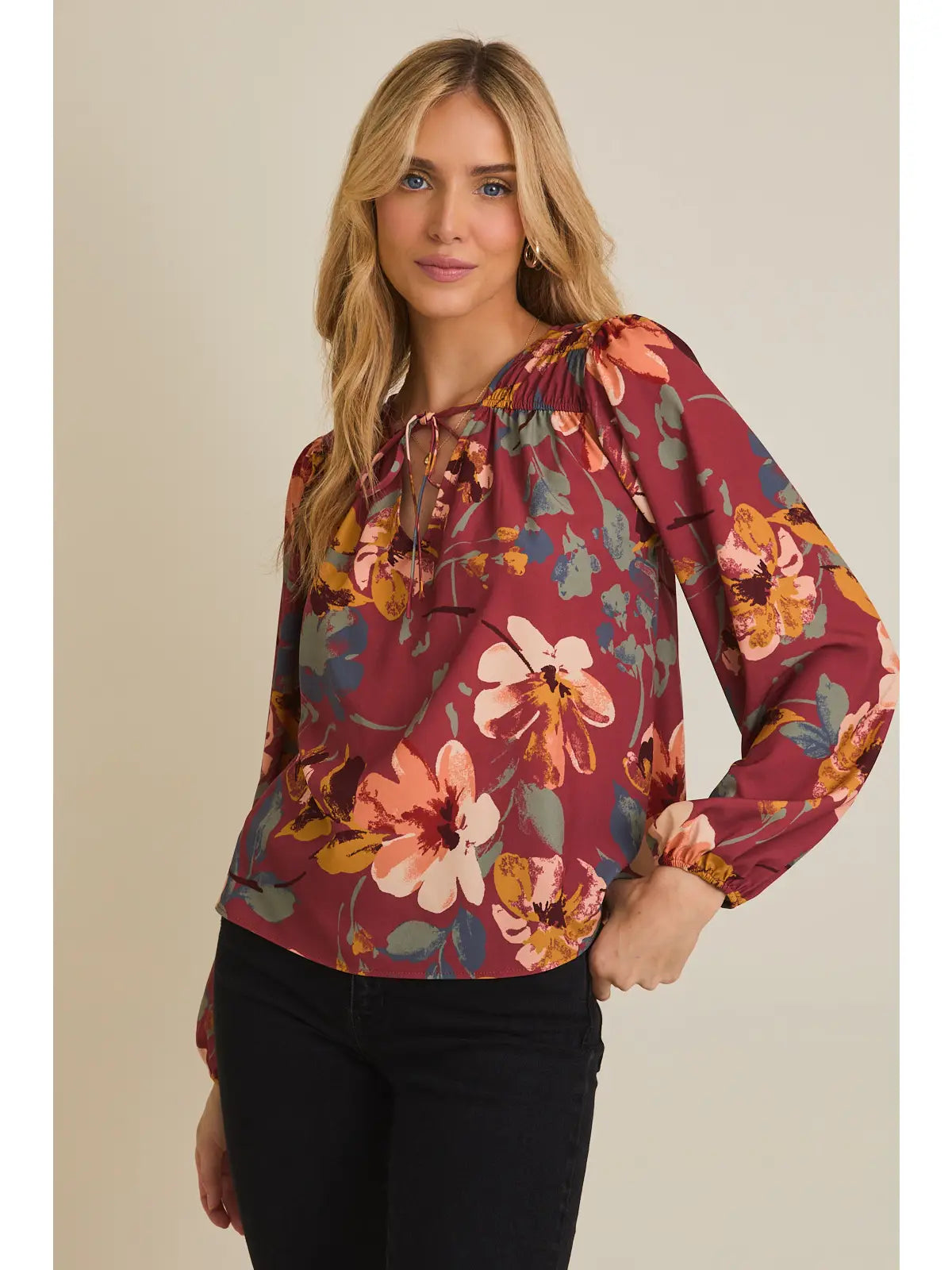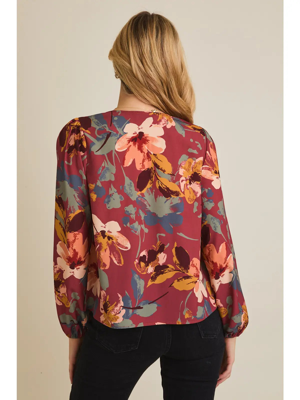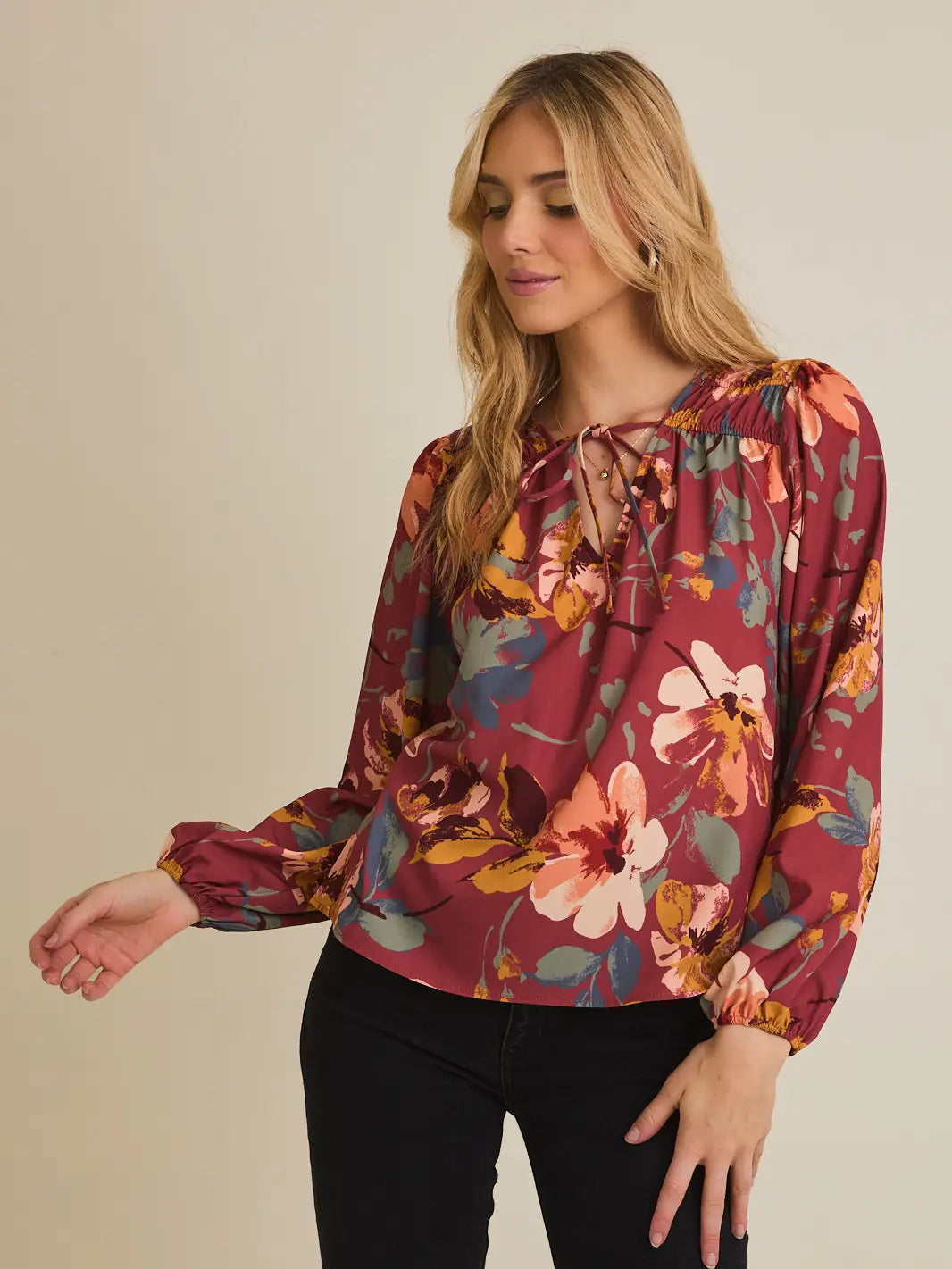 Painted Blossoms Blouse Elevate your everyday wardrobe with this charming blouse that seamlessly transitions from office to weekend. The flattering v-neck design creates a polished silhouette, while the tie neck detail adds a touch of sophistication and styling versatility. Elastic sleeves provide comfortable movement and a refined finish that keeps you looking put-together throughout the day. Perfect for layering or wearing solo, this blouse is the effortless piece you'll reach for again and again.